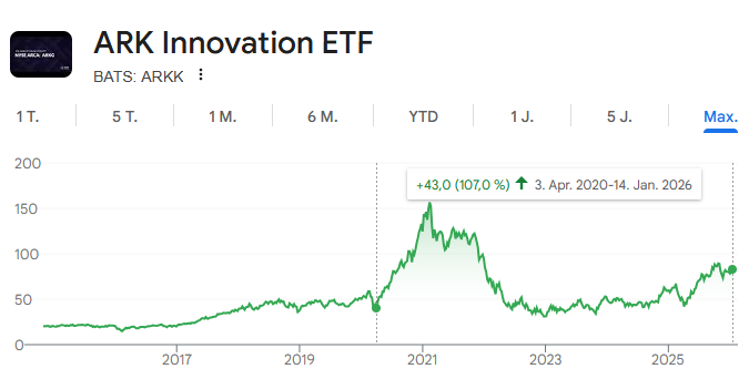 Dieser Beitrag stellt keine Anlageberatung und keine Kauf- oder Verkaufsempfehlung dar, sondern dient ausschließlich der journalistischen Berichterstattung über ein aktuelles Markt- und Unternehmensereignis. Anleger:innen sollten sich vor einer Investitionsentscheidung eigenständig und kritisch mit der Anlagestrategie befassen. Dazu gehört auch ein Blick auf die bisherige Performance vergleichbarer Produkte von Cathie Wood und ARK Invest: Der ARK Innovation ETF (ARKK) erreichte seinen Höchststand in den Jahren 2020 und 2021, konnte dieses Niveau jedoch langfristig nicht halten. Im direkten Vergleich mit dem Nasdaq, der seit 2020 um über 230 Prozent zulegen konnte, wird eine deutliche Underperformance des ARKK sichtbar. Vergangene Wertentwicklungen sind kein verlässlicher Indikator für zukünftige Ergebnisse, unterstreichen jedoch die Bedeutung einer sorgfältigen, eigenverantwortlichen Analyse.