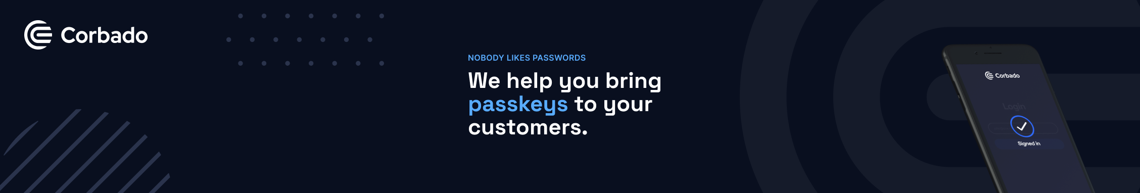 Corbado unterstützt E-Commerce- und SaaS-Unternehmen bei der Umstellung ihrer Endkunden auf Passkeys (Anmeldung mit Face ID, Touch ID oder Windows Hello). Endkunden können sich sicher und einfach anmelden und benötigen kein Passwort mehr. Corbado kümmert sich um alle Cross-Device- und Cross-Platform-Aspekte, guidet den Endkunden und ist einfach zu integrieren. Conversion- und Sign-up-Raten können drastisch gesteigert und die IT-Sicherheit immens verbessert werden.